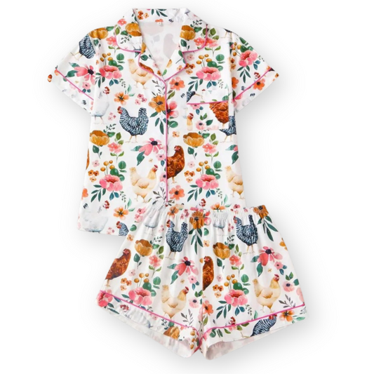 Ceylan Women's Pajama Set: Whimsical Floral Chicken Print