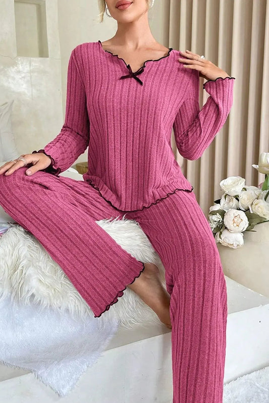 Ceylan Women’s Ribbed Knit Pajama Set Contrast Bow Detail