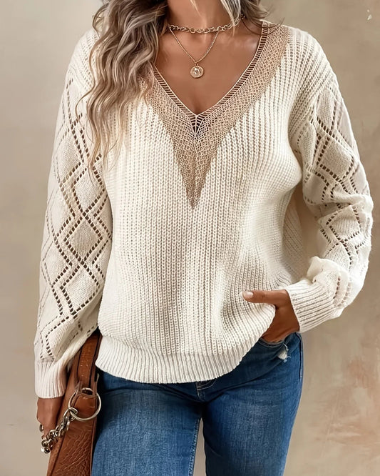 Ceylan Women's Sweater Lace Trim V-Neck Pointelle Knit Sleeve