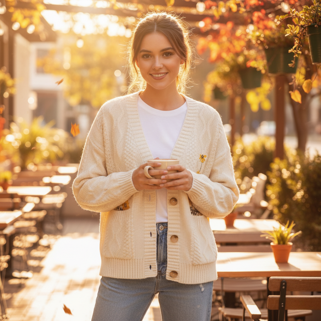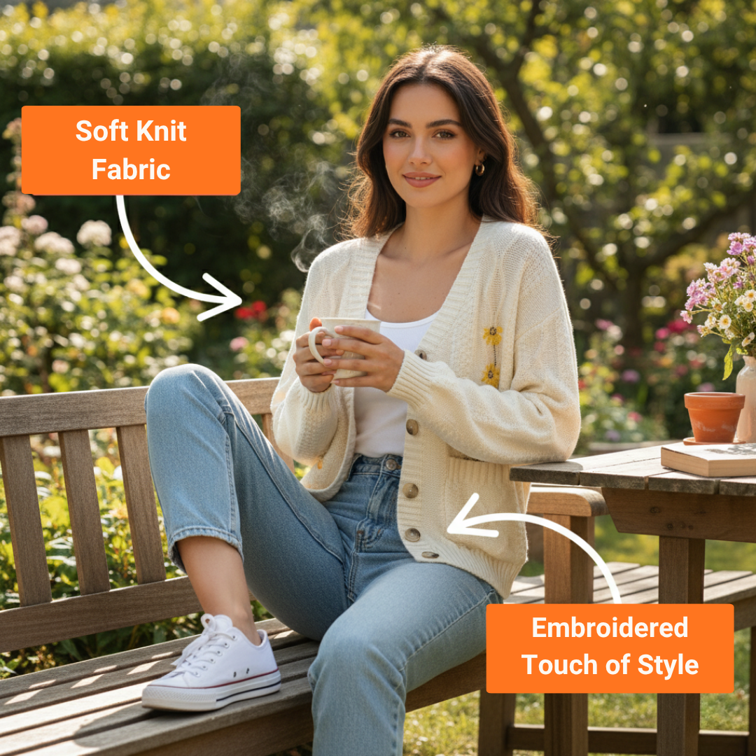 The Ceylan® Embroidered Boho Floral Cardigan blends soft premium knit with hand-stitched daisy embroidery a timeless layer you’ll reach for on cozy mornings, brunch dates, or evening walks.