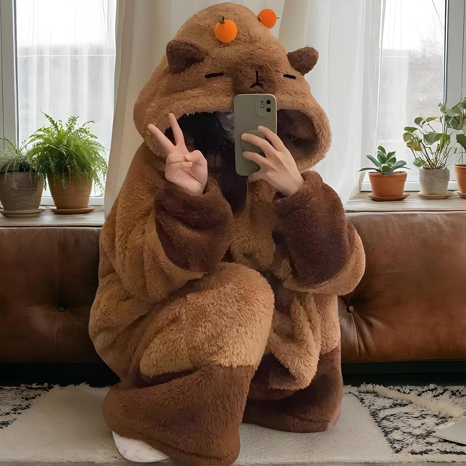 This two-piece oversized plush loungewear set features a long robe with a novelty Capybara hood and matching full-length pajama pants. Crafted from incredibly soft, high-pile fleece, the loose, relaxed silhouette is designed for maximum warmth and comfort during the coldest months. It's the perfect choice for luxurious lounging, cozy evenings at home, or comfortable cold-weather sleep.