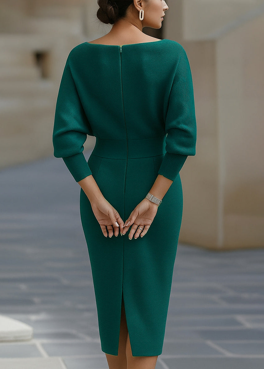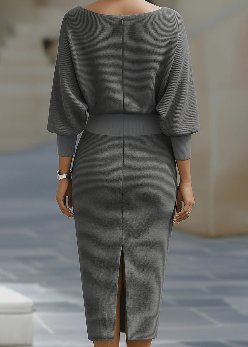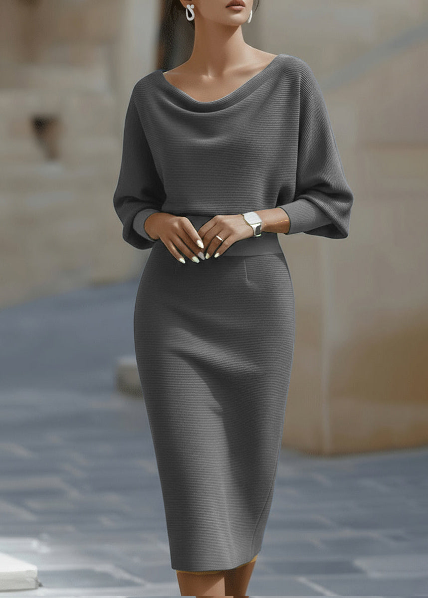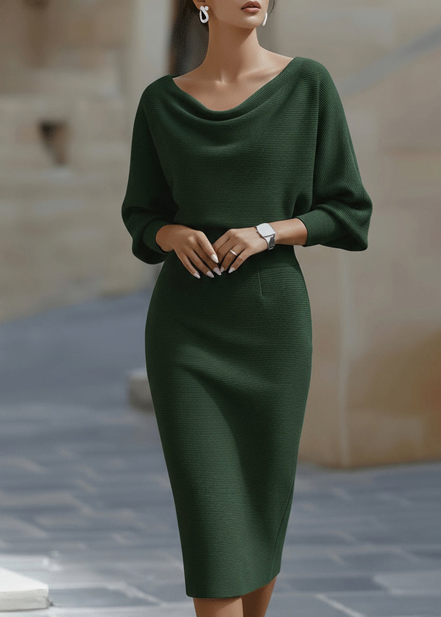 This exquisite midi dress defines modern grace, featuring a voluminous draped batwing bodice contrasted by a sleek, form-fitting skirt. Crafted from a premium textured knit that offers substantial stretch and a refined matte finish, the design is centered around a soft cowl neckline that exudes effortless poise. Perfect for bridal showers, rehearsal dinners, or high-end gallery openings, this dress balances modest coverage with a striking hourglass profile.