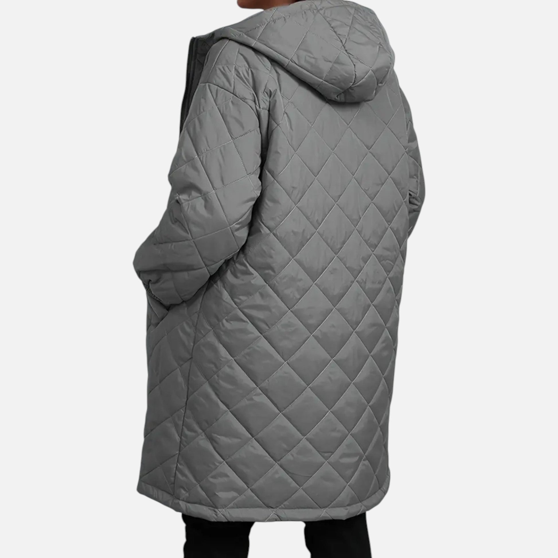 This elegant diamond quilted padded coat offers a sophisticated, yet relaxed, long-line silhouette for maximum warmth. The lightweight shell fabric and insulating fill provide protection without bulk. Perfect for women seeking a premium, minimalist winter coat for daily urban wear.