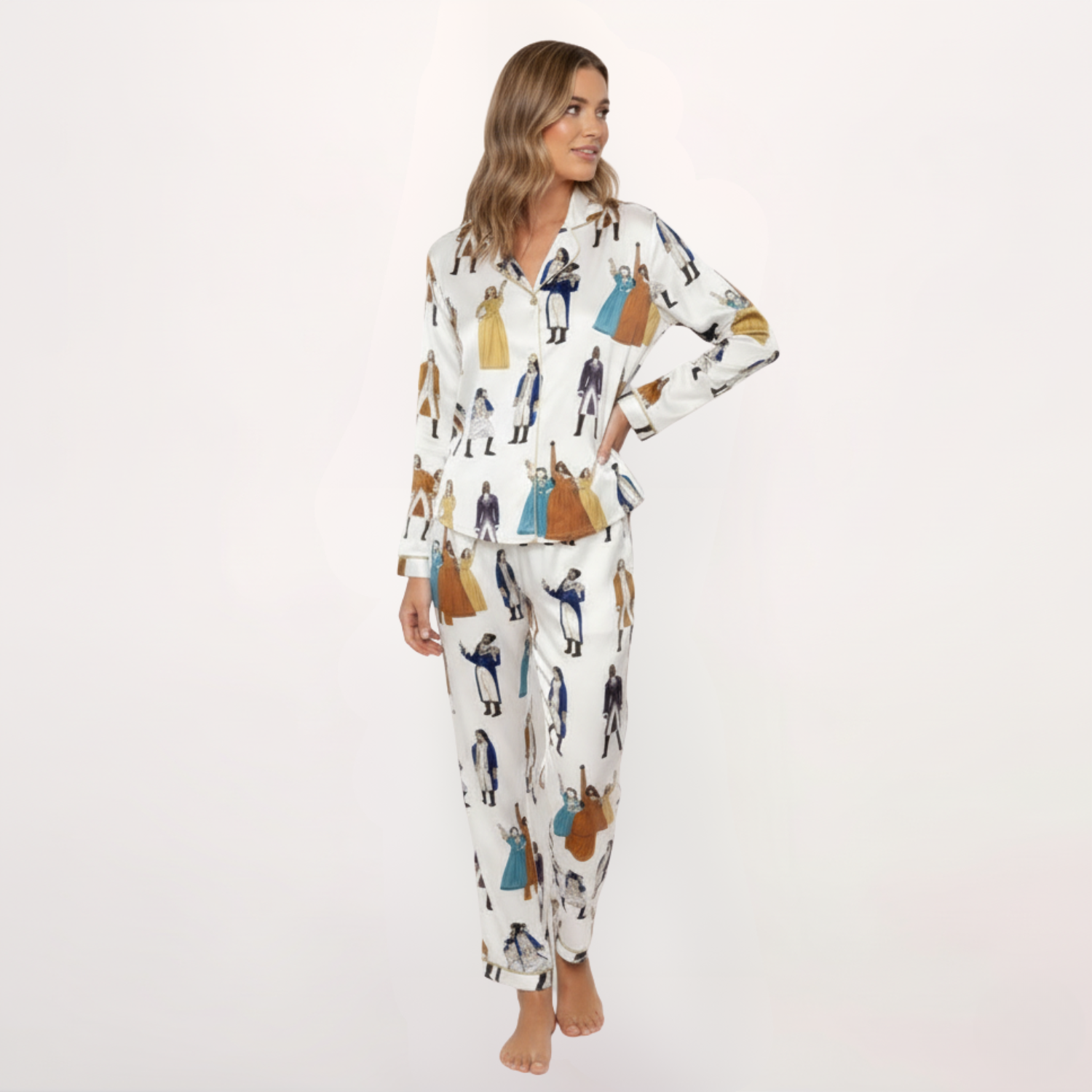 This two-piece short sleepwear set offers a relaxed, classic pajama silhouette, providing effortless comfort and movement. Crafted from a fabric with a smooth, satin-like finish, it drapes beautifully for a luxurious feel against the skin. Featuring a whimsical, all-over print of characters from the beloved Hamilton musical, this set is a chic nod to pop culture fandom. Perfect for stylish, comfortable lounging and sleeping, especially for theater enthusiasts and musical lovers.
