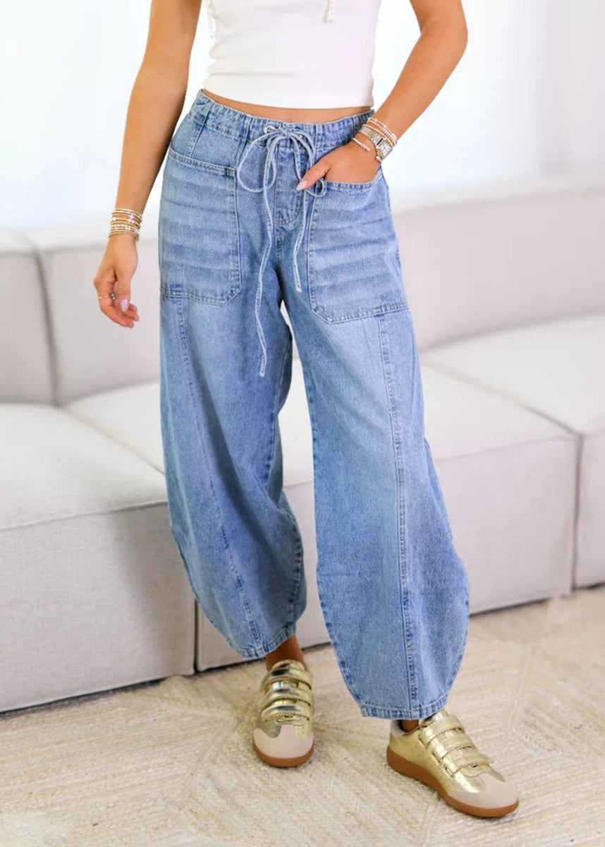 These high-waisted denim pants are engineered for a relaxed, modern silhouette, featuring a distinctive balloon-leg cut that tapers slightly at the ankle. Crafted from premium breathable denim with a soft-wash finish, the design is anchored by a functional drawstring elastic waist and oversized front patch pockets. Perfect for off-duty days or elevated street style looks, these pants offer a non-restrictive fit that maintains its architectural shape from day to night.