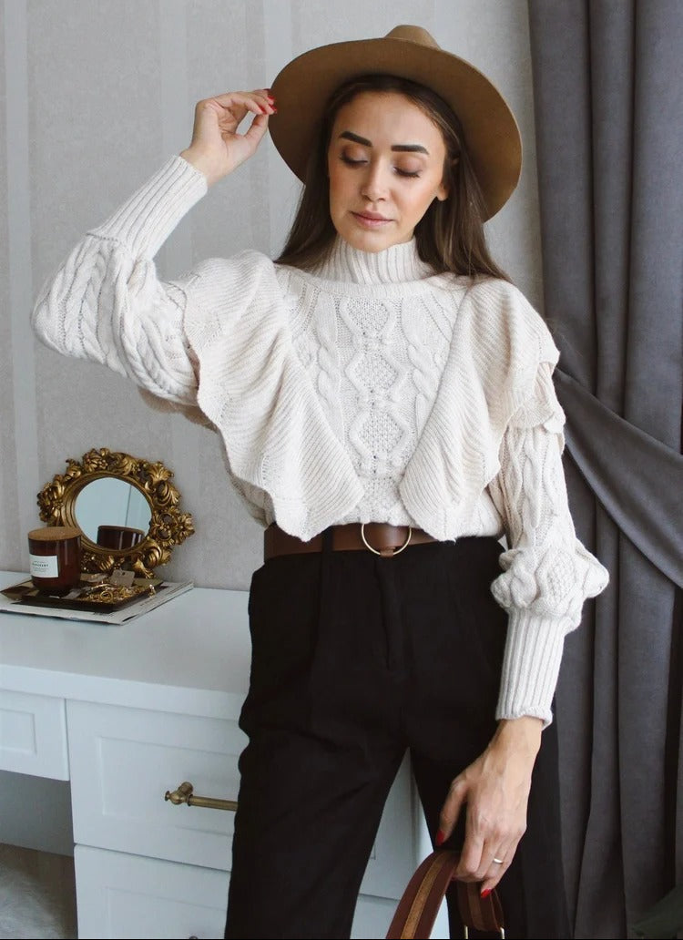 Elevate your knitwear rotation with this architecturally designed pullover, featuring intricate cable knitting and dramatic ruffle detailing that frames the bodice. Crafted from a soft, chunky knit blend, the silhouette boasts voluminous statement sleeves and a high mock neck, offering a perfect balance of vintage-inspired charm and modern structure for sophisticated layering.
