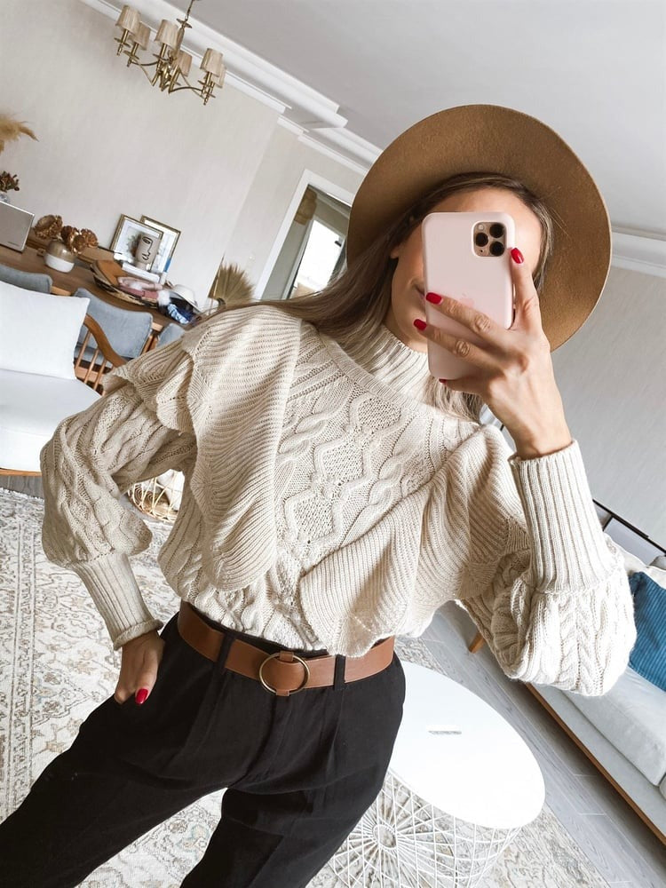 Ceylan Women’s Ruffle Cable Knit Sweater Statement Sleeve