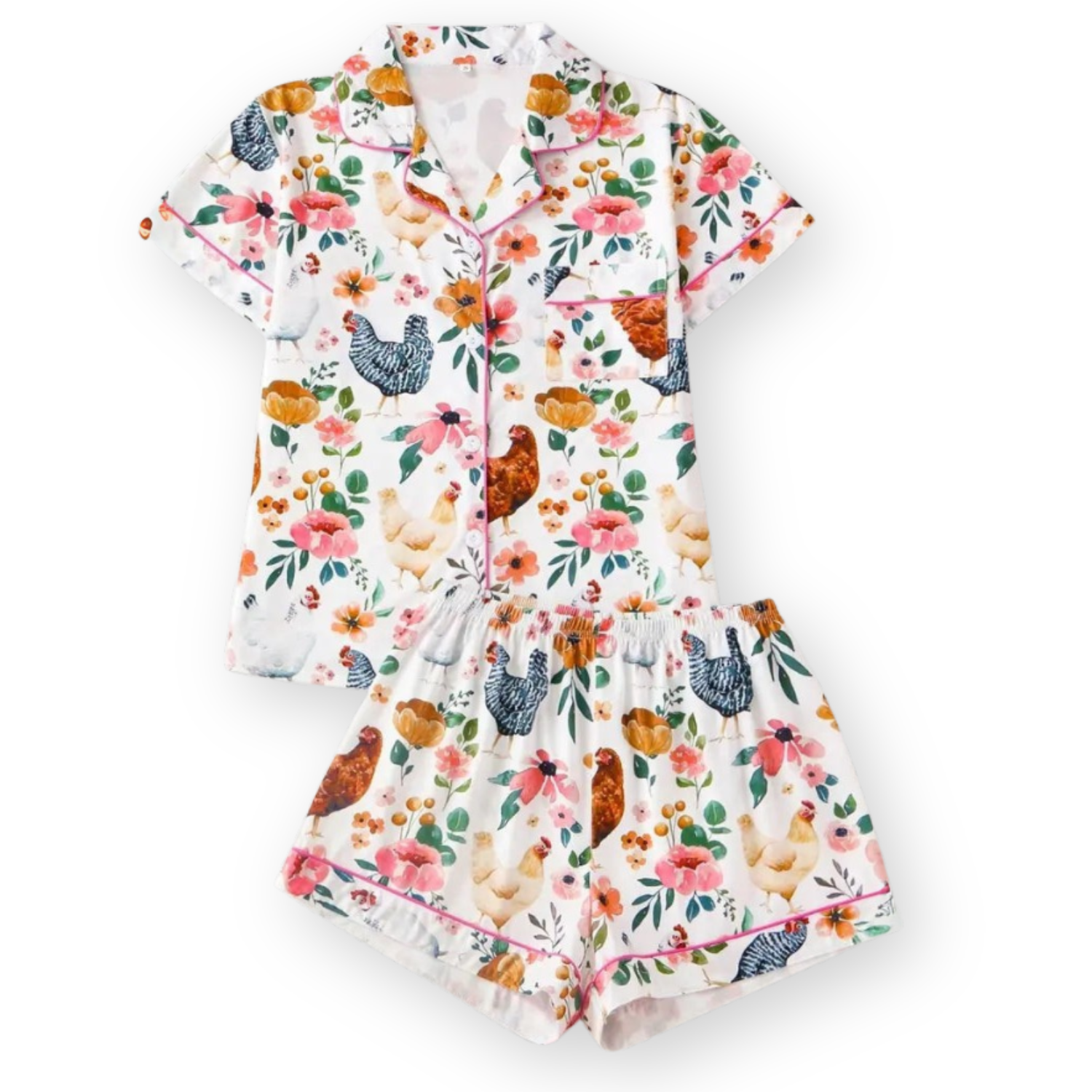 Experience the ultimate blend of whimsy and comfort with the Ceylan Women's Pajama Set, featuring a charming floral chicken print. This two-piece set offers a relaxed, classic button-down shirt silhouette with short sleeves and matching elastic-waist shorts. Crafted from a lightweight, smooth-draping fabric likely a soft polyester or rayon blend it ensures breathability and a comfortable, non-restrictive fit for a perfect night's sleep or relaxed loungewear weekend. The contrast black piping detail elevates the casual silhouette to a more polished look, making this set ideal for year-round indoor wear.