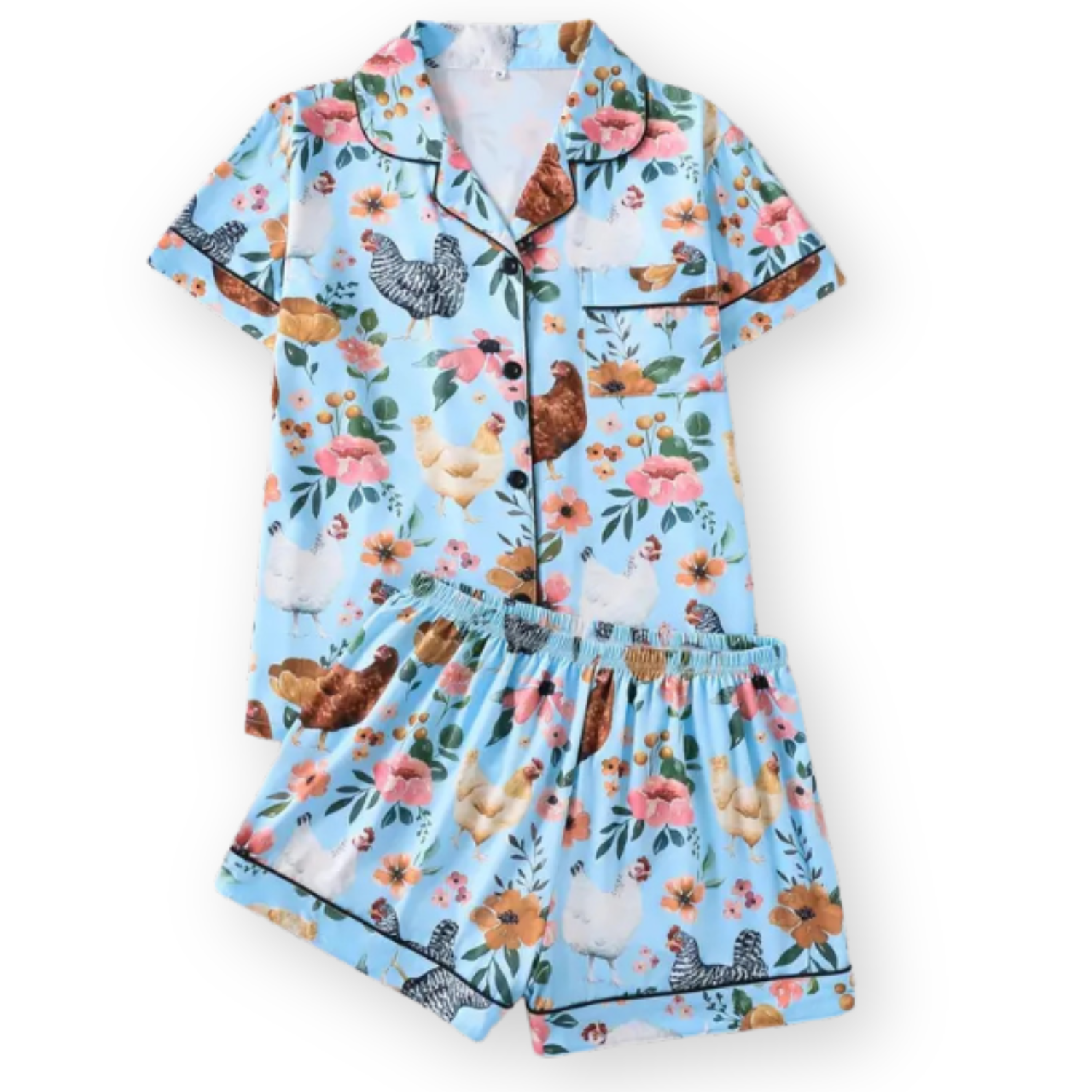 Short sleeve button-up top with notch collar for a classic look Elastic waist shorts ensure all-night comfort and a perfect fit Whimsical chicken print on a light blue ground for a unique, playful style Lightweight, breathable fabric that keeps you cool and comfortable