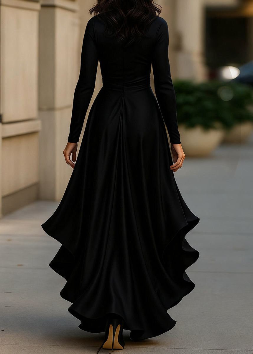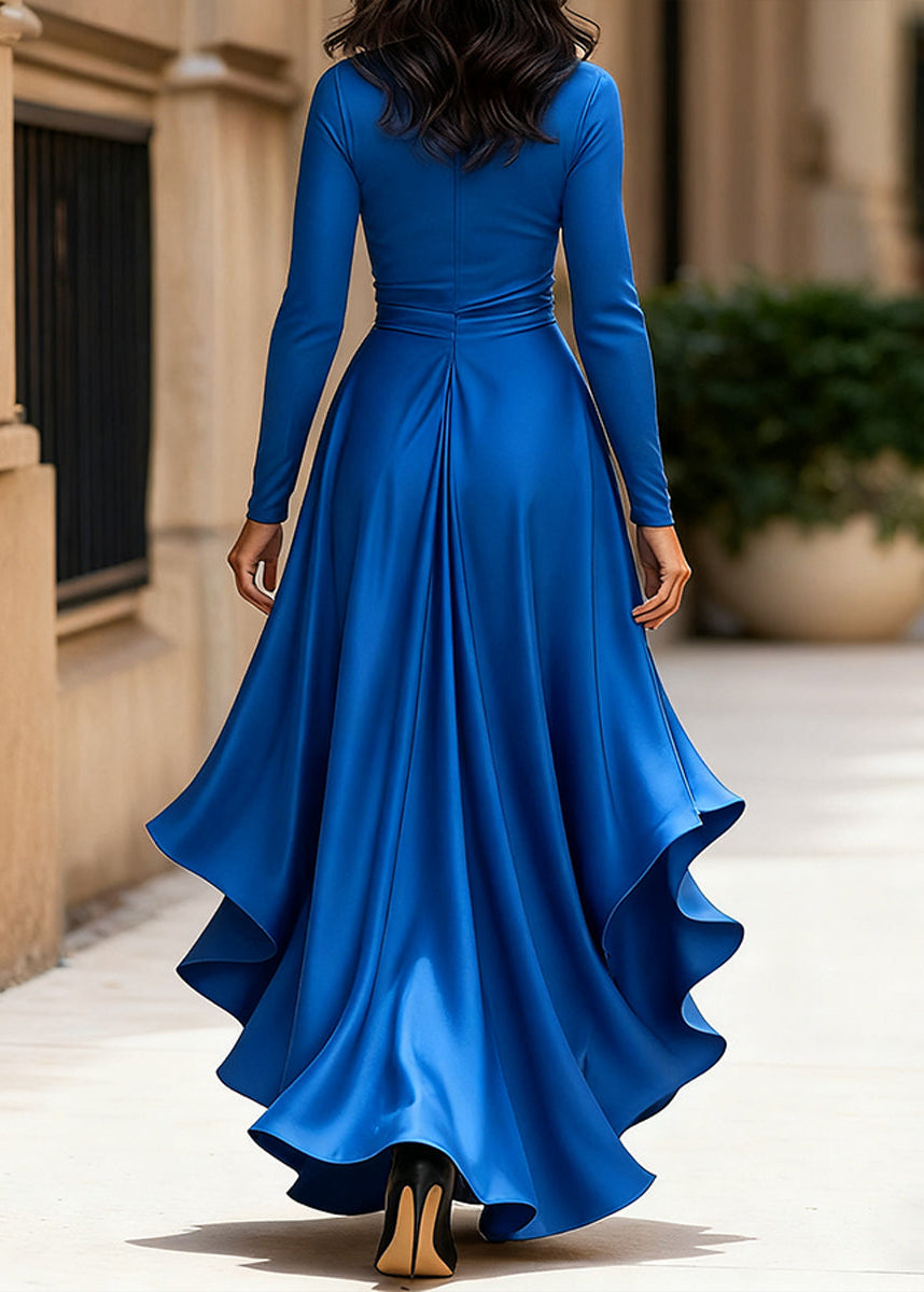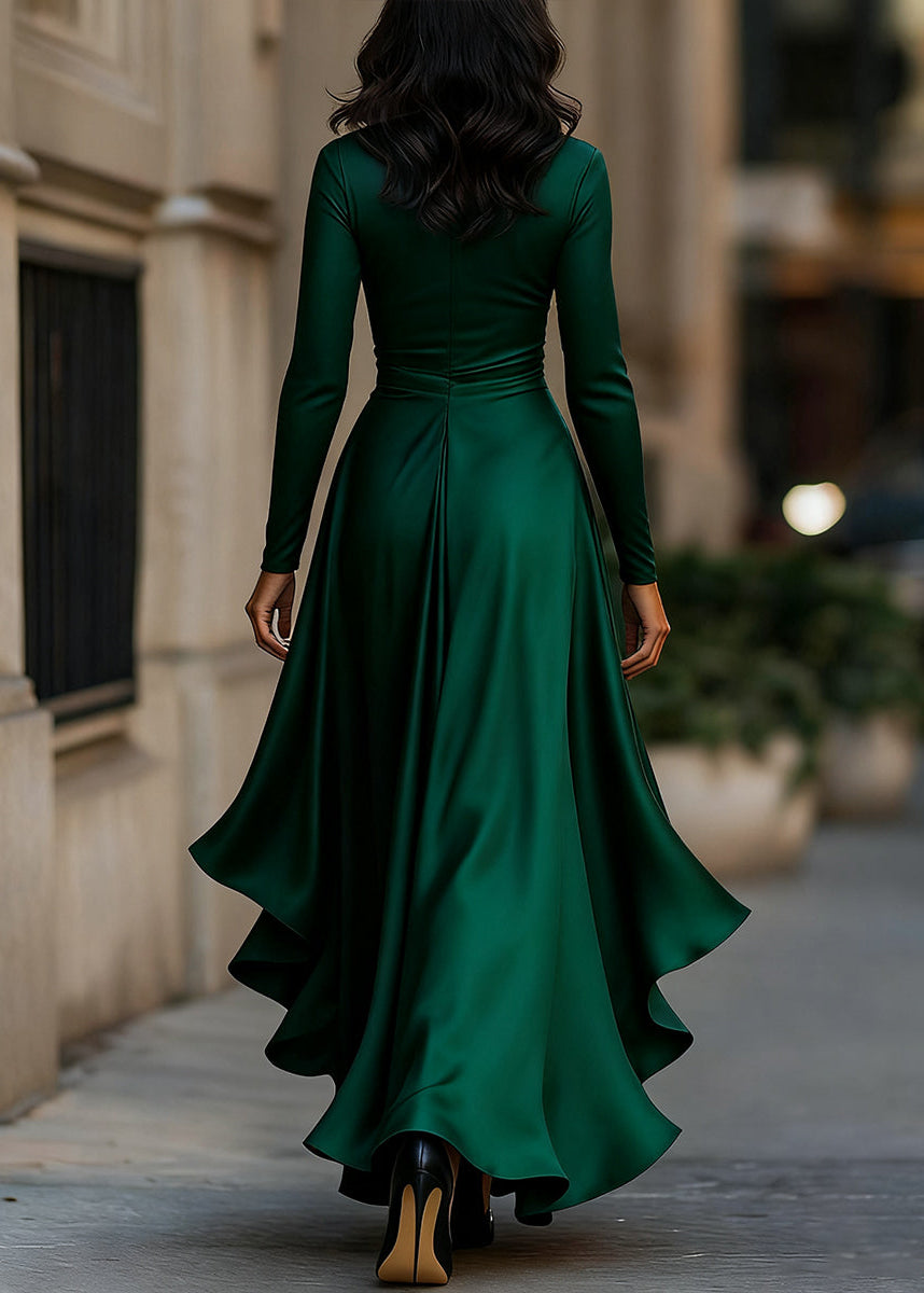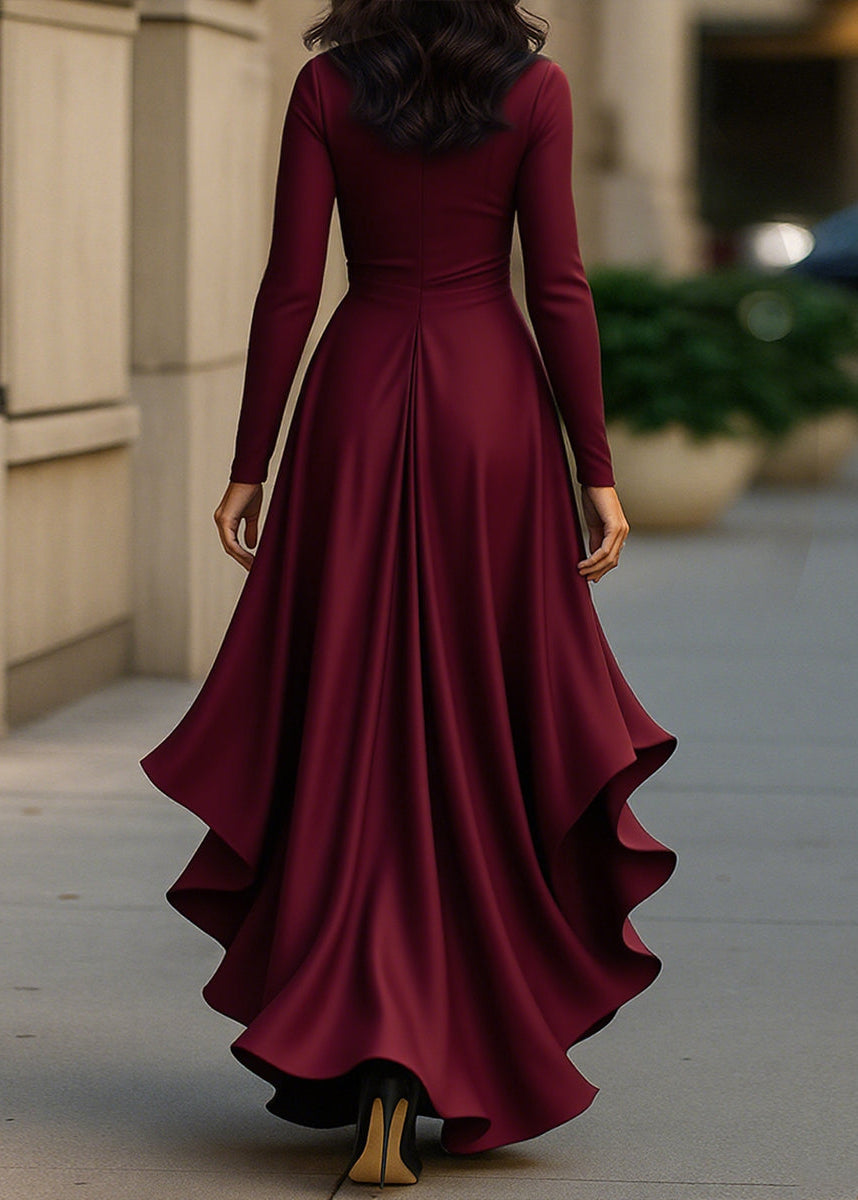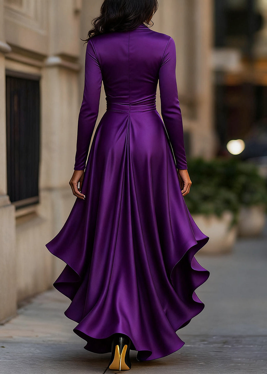 Exude sophistication in this luxurious satin wrap dress. The fluid fabric drapes beautifully, creating a flattering silhouette with a defined waist and a dramatic high-low hemline featuring cascading ruffles. Long sleeves and a V-neckline complete this timeless piece, perfect for formal weddings, galas, and upscale evening events.