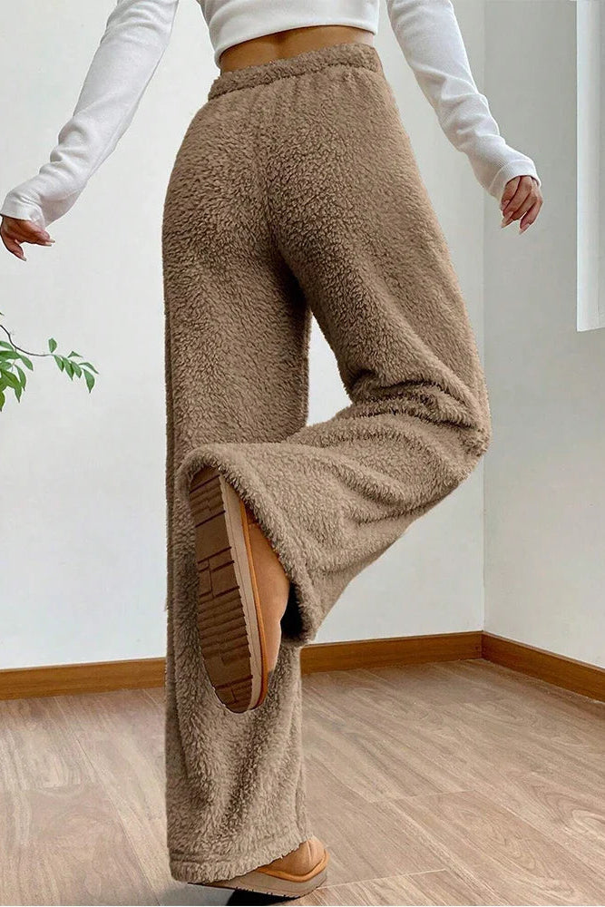 Experience the pinnacle of winter comfort with these ultra-plush sherpa pants. Designed with a relaxed wide-leg silhouette, they offer a modern, flowy look while trapping heat for maximum warmth. The high-rise elastic waistband features a drawstring for a personalized fit, making them the ideal choice for chilly days at home or casual coffee runs.