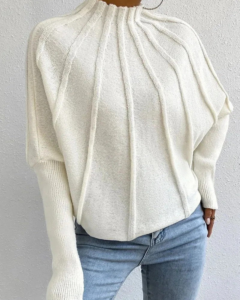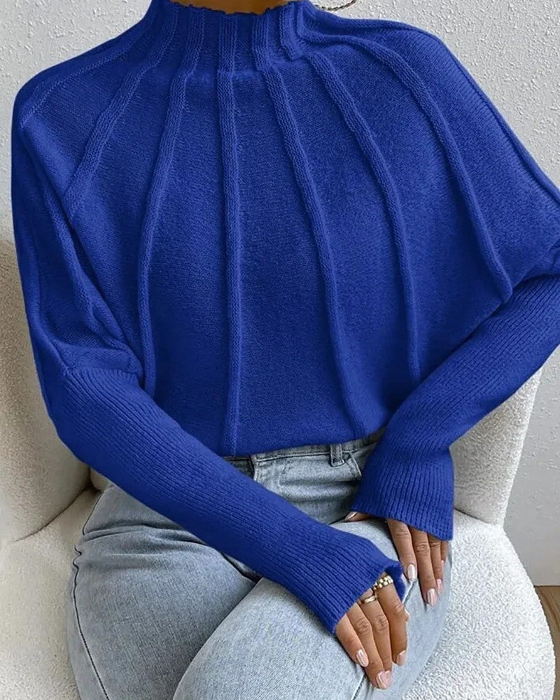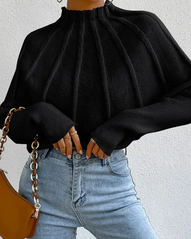This sophisticated pullover features a unique aesthetic defined by bold vertical ribbed panels that fan out from the elegant mock neck collar. The slightly cropped , relaxed silhouette pairs perfectly with high-waisted trousers or jeans, offering a modern, flattering fit. Crafted from a soft, medium-gauge knit, this textured piece provides comfortable warmth and chic dimension, making it an ideal anchor for an elevated casual fall or winter ensemble.