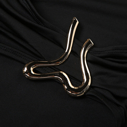 Crafted from a premium stretch fabric that contours the body, this maxi dress combines timeless elegance with contemporary edge. Featuring a high neckline and sophisticated floor-length hem, the design is defined by its striking silver-toned side hardware that creates a flattering cinched effect at the waist. Perfect for galas, black-tie events, or upscale dinners where a commanding presence is required.