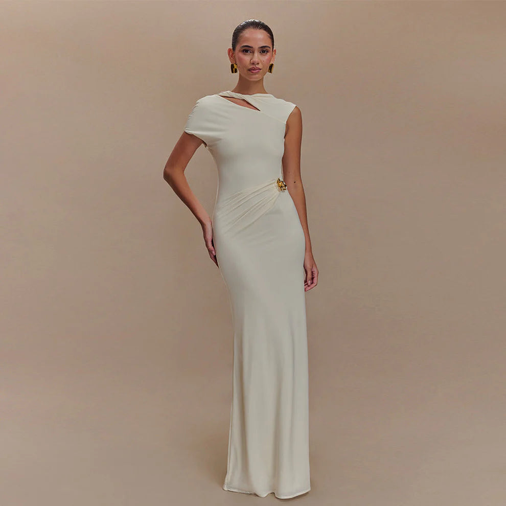 Crafted from a premium stretch-jersey blend that elegantly contours the silhouette, this sheath maxi dress features a striking asymmetric cutout neckline and sophisticated cap-sleeve detailing. The design is elevated by meticulous side-gathering at the waist, anchored by a signature gold-tone hardware brooch that creates a flattering draped effect across the midsection. Its floor-length column silhouette makes it an impeccable choice for black-tie galas, formal wedding guest attire, or high-end cocktail events.